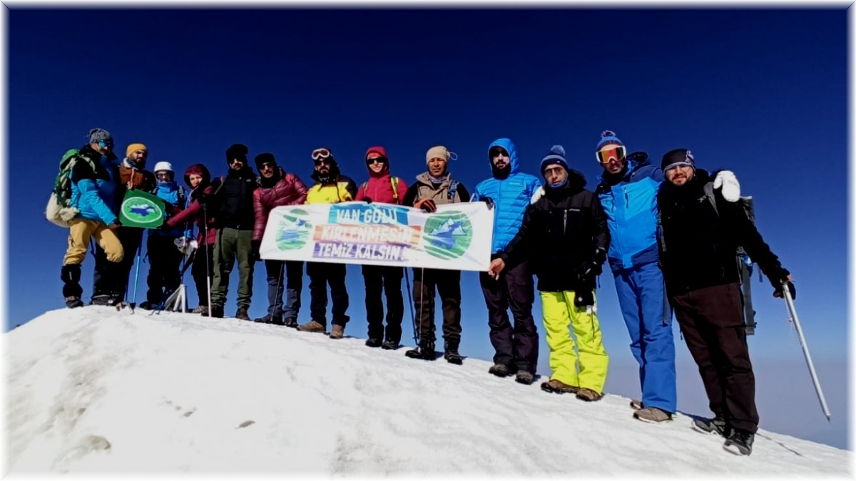 Vadi Doğa Sporları Kulübü üyeleri, 5 bin 137 metrelik rakımıyla Türkiye'nin en yüksek dağı olan Ağrı Dağı'na tırmanarak Van Gölü kirliliği ve küresel ısınmaya dikkat çekti.