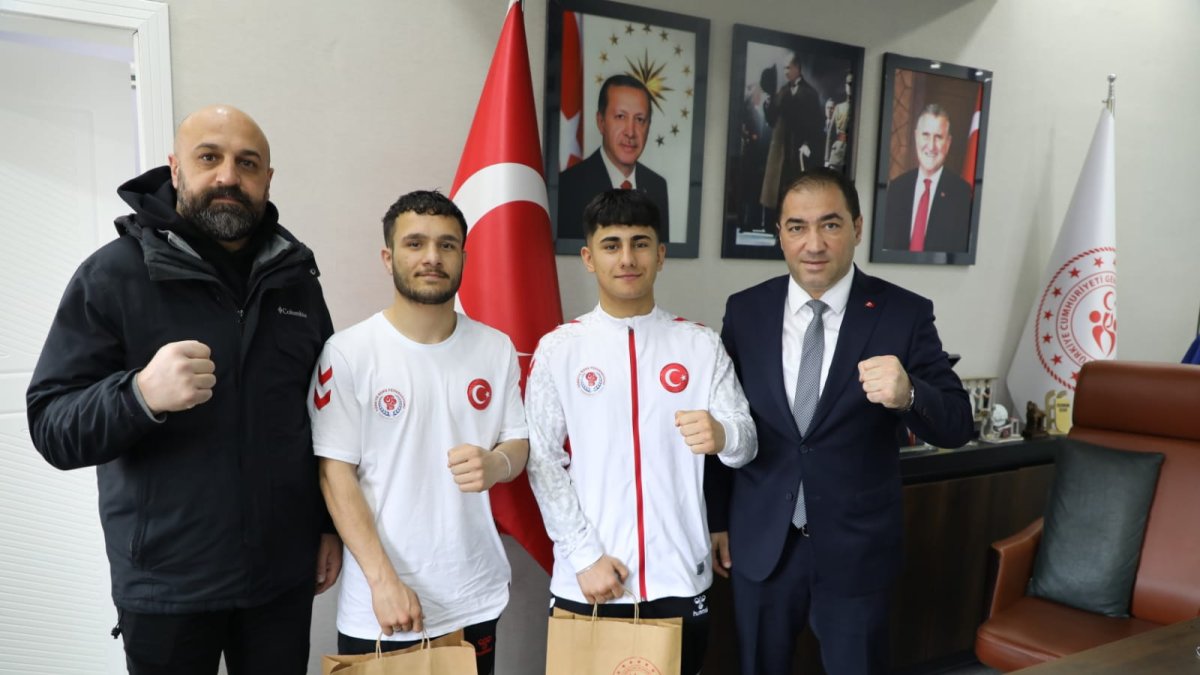 Ağrı Gençlik ve Spor İl Müdürü Ahmet Çelebi, 17-23 Şubat 2025 tarihleri arasında Konya’da düzenlenen Ali Kılınçoğlu ve Turhan Çumralıgil 100. Yıl Büyük Erkekler Türkiye Ferdi Boks Şampiyonası’nda 60 kiloda Türkiye üçüncüsü olan Sezgin Acar ile Karadağ’ın Budva kentinde gerçekleştirilen Gençler Dünya Kupası’nda Türkiye’yi temsil eden Ramazan Alptekin’i makamında kabul etti.