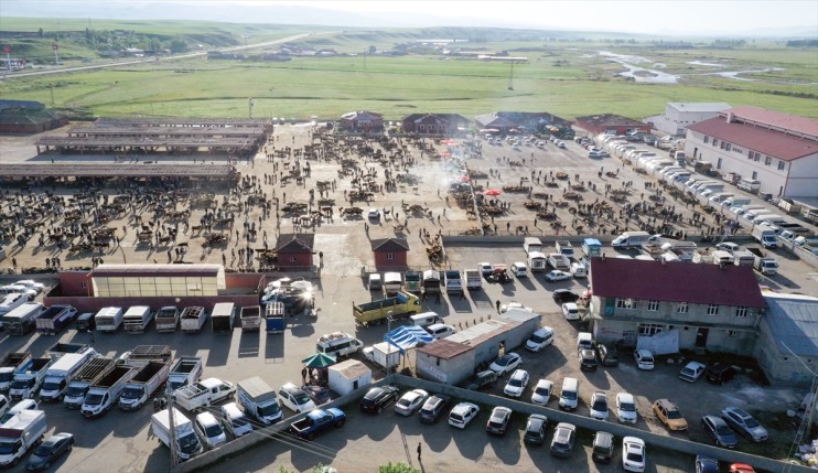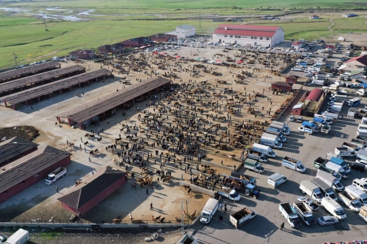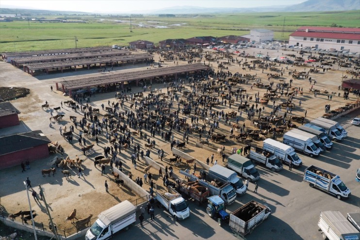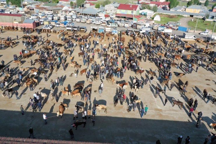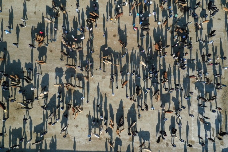 Hayvan pazarındaki yoğunluk, dronla görüntülendi.