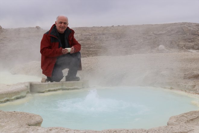 "Dünyada çok az görülebilen, her taraftan doğal şekilde jeotermal kaynaklar çıkıyor. Bunlar aslında bizim doğal şofbenlerimiz. Su giriyor, yerin derinliklerinde ısınıyor ve yeryüzüne çıkıyor. Bu bizim için çok önemli bir kaynaktır, çevre dostudur ve zararsızdır. Ciddi şekilde ele alındığı zaman ekonomiye muazzam katkılar sağlayabilir. Biz şu an o jeotermal kaynakların yeryüzüne akıp giden bir tanesinin yanındayız. Muazzam bir potansiyel. Sıcak suyun 200 metre derinlikten geldiğini biliyoruz."