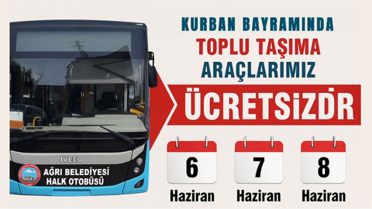 Ağrı Belediyesi, Kurban Bayramı dolayısıyla şehir içi toplu taşıma araçlarının 6, 7 ve 8 Haziran 2025 tarihlerinde ücretsiz hizmet vereceğini açıkladı.