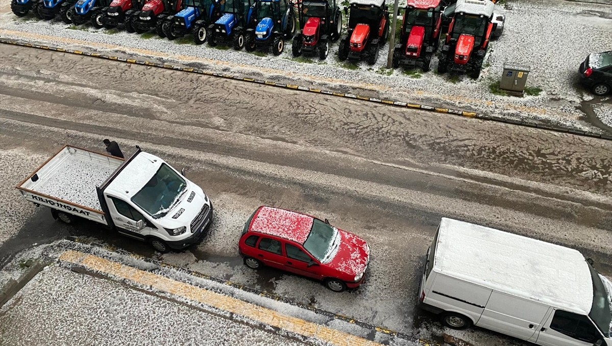 Kısa süreli yağışın ardından etraf beyaza büründü, park halindeki araçların üzeri dolu taneleriyle kaplandı.