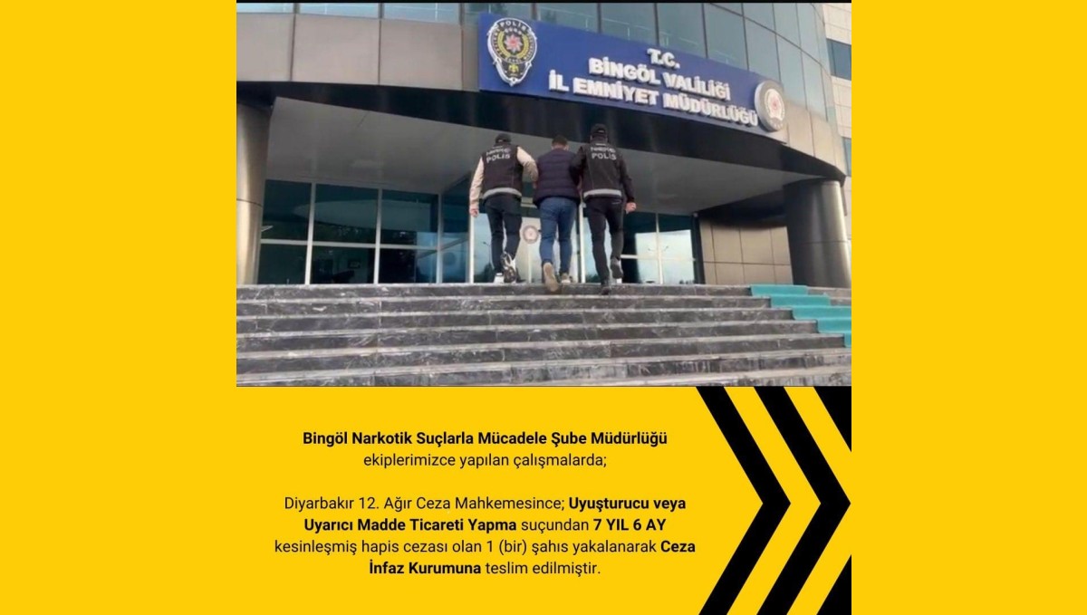 Bingöl'de 7 yıl 6 ay kesinleşmiş hapis cezası ile aranan zanlı polis ekipleri tarafından yakalandı.