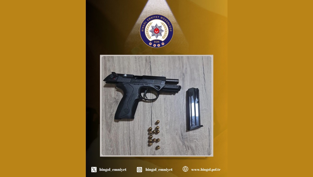 BİNGÖL (İHA) - Bingöl Emniyet Müdürlüğü Terörle Mücadele Şube Müdürlüğü ekipleri şüpheli bir aracı durdurup arama yaptı. Aramada, Beretta Gardone marka ruhsatsız tabanca, 1 adet şarjör içerisinde 12 adet STR24 ibareli 9x19 milimetre fişek ele geçirildi. Olayla ilgili bir şüpheli hakkında adli işlemlere başlandığı belirtildi.