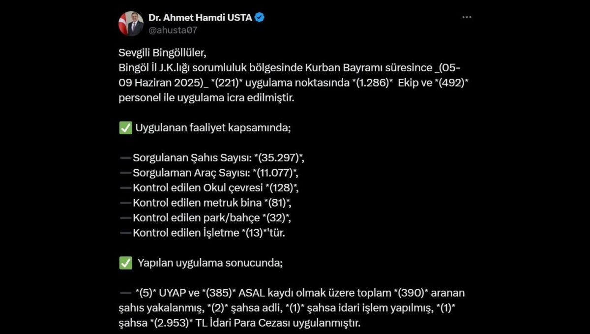 Uygulamalarda, 390 aranan şahıs yakalanırken, 2 şahsa adli ve 1 şahsa idari işlem yapıldığı bildirildi. Aynı zamanda 181 araca toplam 504 bin 804 TL idari para cezası uygulandığı, 1 hacizli aracın yakalandığı ve 38 aracın trafikten men edildiği aktarıldı.