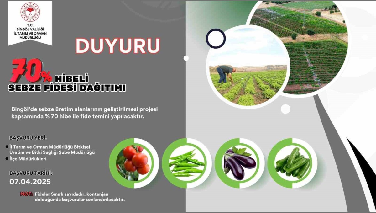 BİNGÖL (İHA) - Bingöl Tarım ve Orman Müdürlüğünden yapılan açıklamada, Tarım Arazilerinin Kullanımının Etkinleştirilmesi Projesi (TAKE) kapsamında kentte sebze yetiştiriciliği yapan üreticilere yüzde 70 hibe ile sebze fidesi temin edileceği belirtildi. Başvurunun merkez ve merkez köyler, Tarım ve Orman İl Müdürlüğü Bitkisel Üretim ve Bitki Sağlığı Şube Müdürlüğü, ilçeler ve köyleri, İlçe Tarım ve Orman Müdürlüklerinden yapılacağı belirtilen açıklamada, kurumdan verilecek başvuru dilekçesi, üretim yapılacak arazinin Çiftçi Kayıt Sistemine (ÇKS) kayıtlı olduğuna dair belgenin isteneceği kaydedildi.