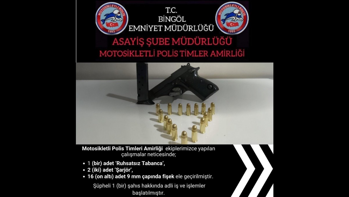 BİNGÖL (İHA) - Bingöl Emniyet Müdürlüğü Motosikletli Polis Timleri Amirliğince yapılan çalışmalar kapsamında 1 adet ruhsatsız tabanca, 2 adet şarjör, 16 adet 9 milimetre çapında fişek ele geçirildi. Şüpheli şahıs hakkında adli işlem başlatıldı.