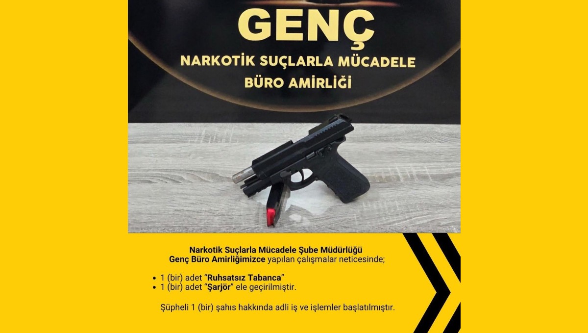 BİNGÖL (İHA) - Bingöl İl Emniyet Müdürlüğü ekipleri kent genelinde huzur ve güvenliğin sağlanması için çalışmalarını sürdürüyor. Bu çerçevede yapılan çalışmalarda, 1 ruhsatsız tabanca, 1 şarjör ve 5.25 gram reçine esrar ele geçirildi. Olaya ilişkin 2 şüpheli hakkında adli işlem başlatıldığı bildirildi.
