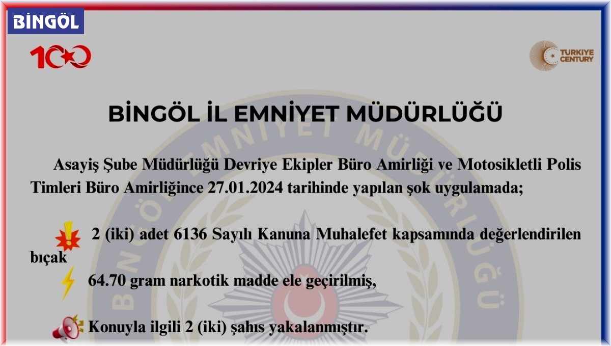 Bingöl: Bingöl İl Emniyet Müdürlüğü'nden yapılan açıklamada, "Asayiş Şube Müdürlüğü Devriye Ekipler Büro Amirliği ve Motosikletli Polis Timleri Büro Amirliğince yapılan şok uygulamada, 2 adet bıçak, 64 gram narkotik madde ele geçirilmiştir. Konuyla ilgili iki şahıs yakalanmıştır. Vatandaşlarımızın huzur ve güvenliğinin sağlanması, kamu düzenine uygun olmayan hareketlerin işlenmesinin önlenmesi kapsamında İl Emniyet Müdürlüğümüz görevlileri tarafından çalışmalarımız büyük özveri ve fedakarlıkla devam etmektedir" denildi.