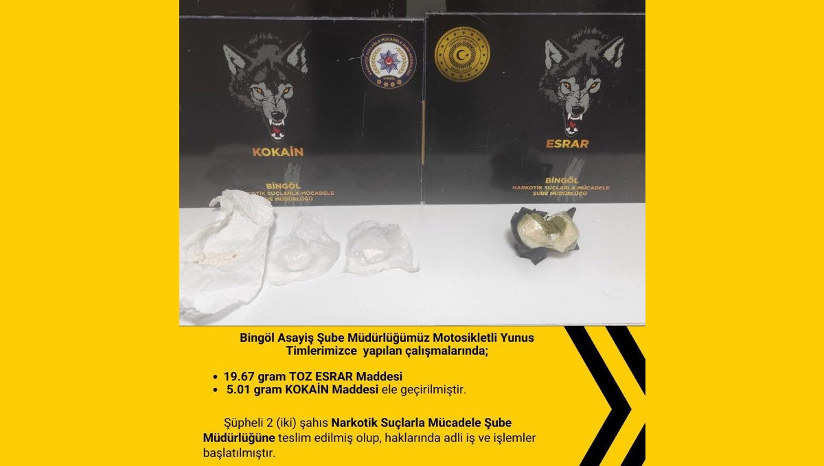 BİNGÖL (İHA) - Bingöl Emniyet Müdürlüğü Asayiş Şube Müdürlüğü motosikletli yunus timlerince yapılan çalışmalar neticesinde 20 gram toz esrar ile 5 gram kokain ele geçirildi. 2 şüpheli hakkında adli işlem başlatıldı.