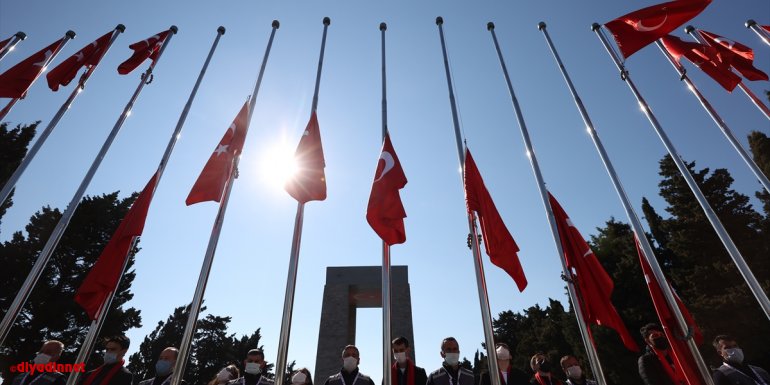 ÇANAKKALE - Aile, Çalışma ve Sosyal Hizmetler Bakanlığının, 18 Mart Şehitleri Anma Günü ve Çanakkale Deniz Zaferi'nin 106. yıl dönümü dolayısıyla düzenlediği "Anadolu Gönül Yolu-81 Genç 81 Bayrak" etkinliği kapsamında Şehitler Abidesi'ne getirilen Türk bayrakları göndere çekildi.