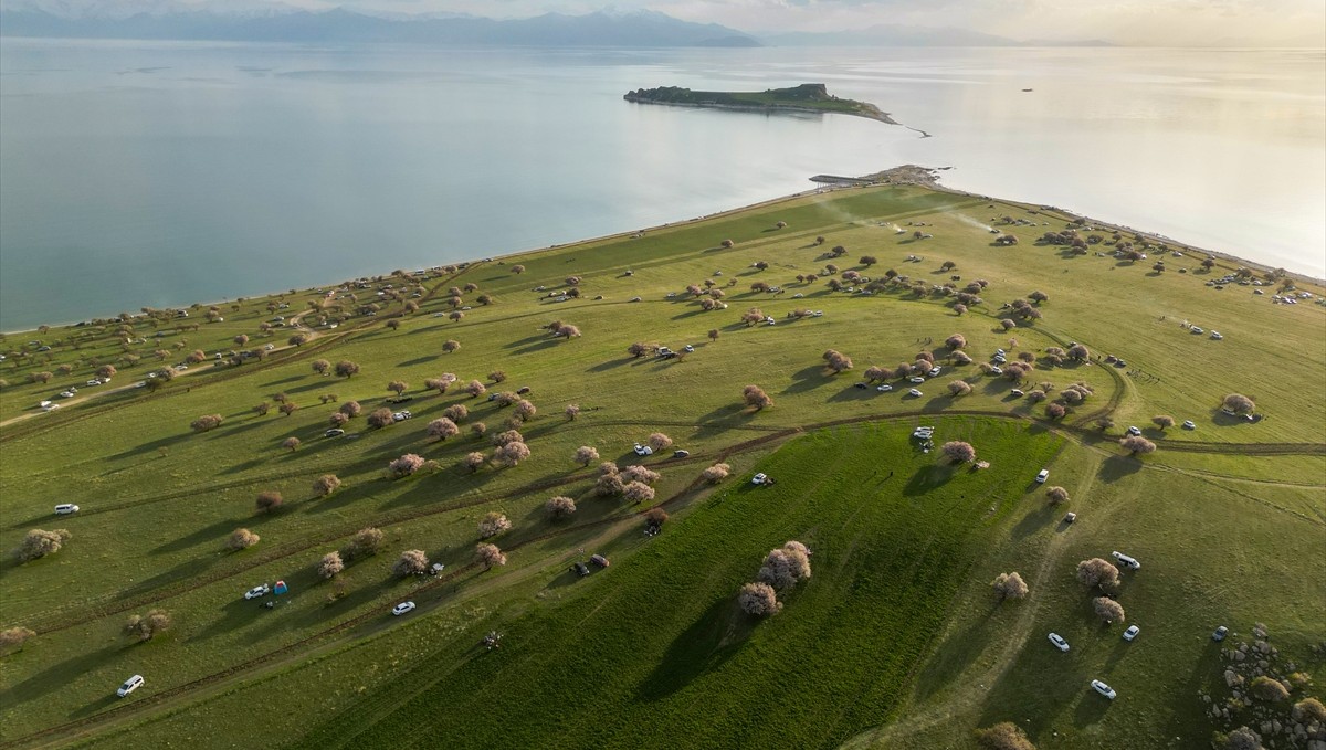 Van Gölü'nün kuzeydoğusunda yer alan yarımada, ağaçların çiçek açması ve doğanın canlanmasıyla seyrine doyum olmayan manzaraya büründü.