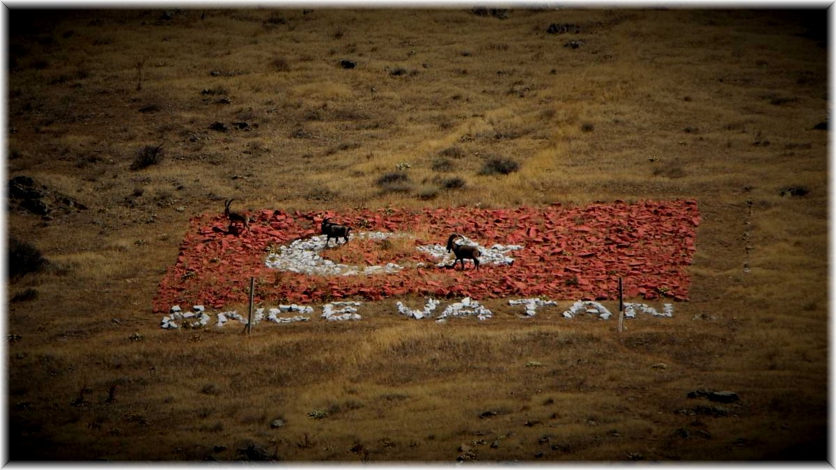 Dağ keçilerinin, Elazığ'da 16 şehri birbirine bağlayan Kömürhan Köprüsü mevkiinde taşlarla oluşturulan Türk bayrağı ile bir kareye girmesi güzel görüntü oluşturdu. Bu sırada bölgeden geçen bir bir sürücünün keçilere seslenmesi gülüşmelere neden oldu.