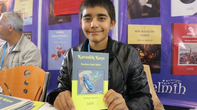 Elazığ - Kahramanmaraş merkezli 6 Şubat'taki depremlerden etkilenen Malatya'da evlerinin ağır hasar görmesi nedeniyle ailesiyle çadır kentte yaşamaya başlayan 13 yaşındaki İbrahim Halil Sert, yazdığı "Karanlık Kuşu" adlı kitabını Elazığ'da fuarda imzaladı.