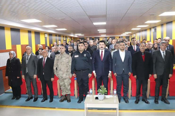 Kutlama programı, Diyadin Mesleki Teknik ve Anadolu Lisesi Konferans Salonu'nda devam etti. Buradaki etkinlikler Saygı Duruşu ve İstiklal Marşı ile başladı. Programda konuşan Kaymakam Mustafa Karalı, Diyadin'in tarihi ve doğal güzelliklerine dikkat çekerek ilçenin adının, Ziyaeddin Bey tarafından yaptırılan kaleden zamanla "Diyadin"e dönüştüğünü belirtti.