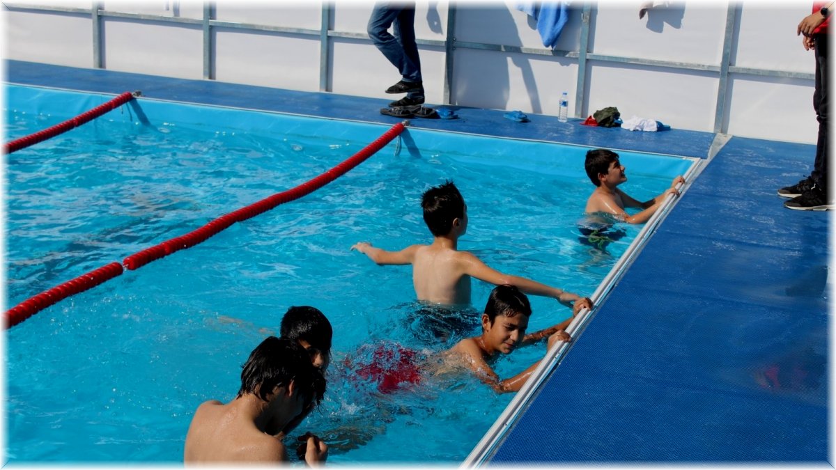 Malatya'nın Doğanşehir İlçesi'nde hizmete sunulan portatif havuzda çocuk ve gençler hem serinliyor hem de yüzmeyi öğreniyor.