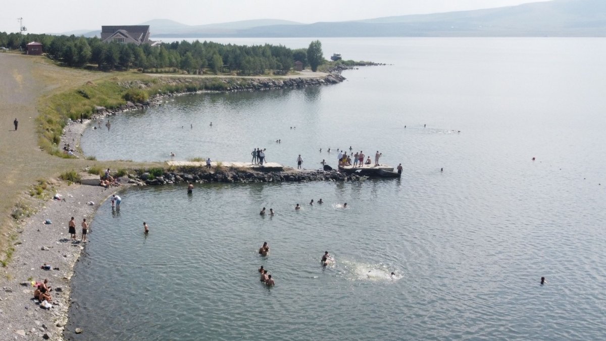 Kars - Son yılların en sıcak yazının yaşandığı ve hava sıcaklığının 32 dereceyi gördüğü Kars'ta vatandaşlar kendilerini bayram tatilini fırsat bilerek Çıldır Gölü kıyılarına attı.