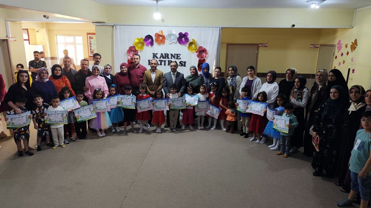 Ağrı'nın Doğubayazıt ilçesinde İlçe Müftülüğü ile Aile Destek Merkezi koordinasyonunda faaliyet gösteren Adem İki 4-6 Yaş Kur’an Kursu öğrencileri için karne töreni düzenlendi.