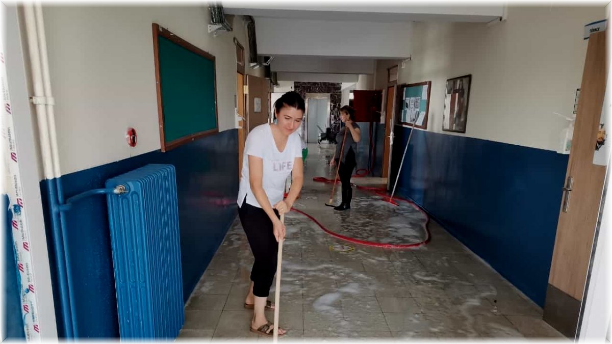 Okulların pazartesi açılması için gerekli hazırlıklar öğretmenlerin fedakar çalışması ile yapıldı. Eğitimciler, sınıf ve derslikleri temizledi.