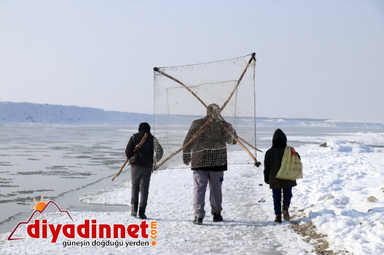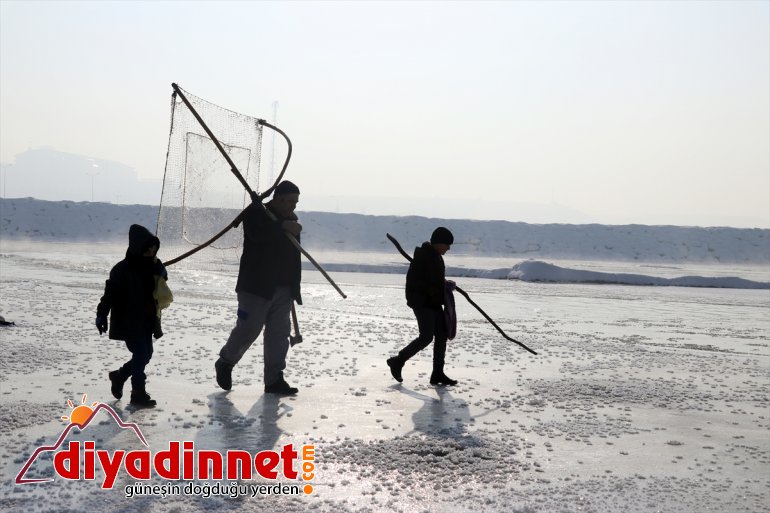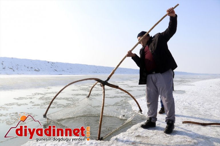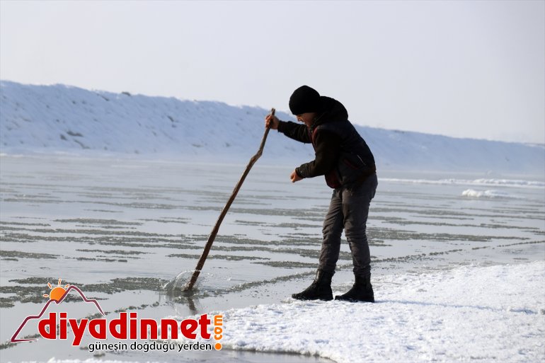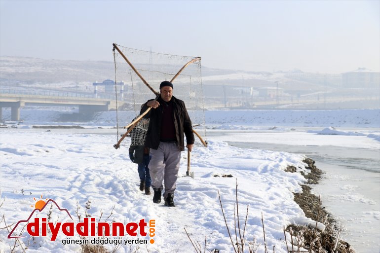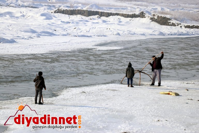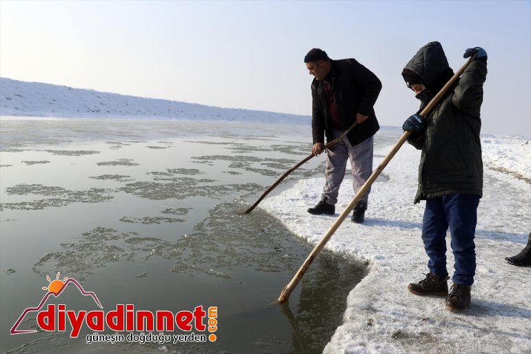 Yaz aylarında farklı işlerde çalışarak ailelerinin geçimini sağlayanlar, dondurucu soğukların ardından yüzeyi buz tutmaya başlayan Murat Nehri'nde balık avına başladı.