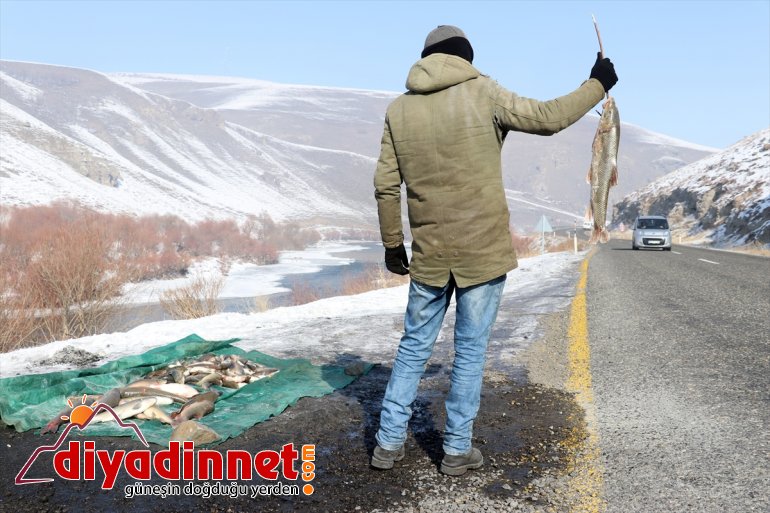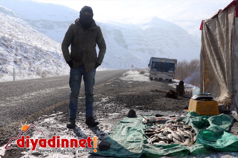 Dondurucu soğuklarda ve zorlu bir mücadelenin ardından çuvallara doldurulan balıklar Ağrı-Van kara yolunun kenarında satılmaya çalışılıyor.