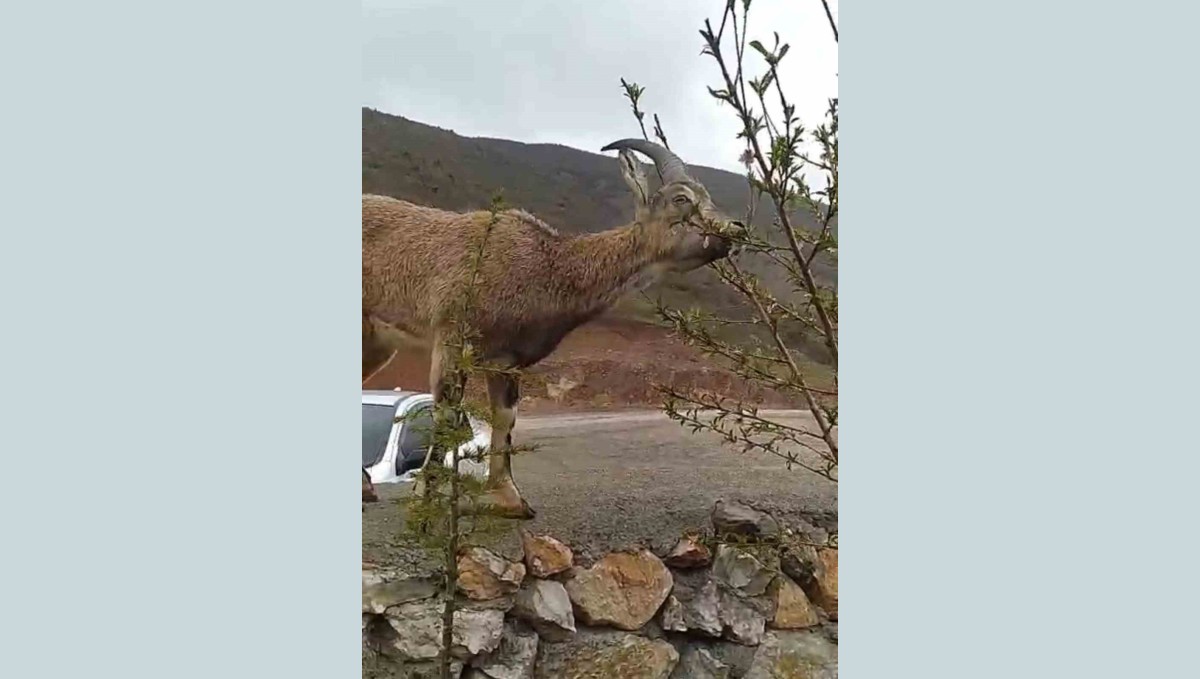 ELAZIĞ (İHA) - Elazığ'ın Palu ilçesine bağlı Arındık köyünde bir dağ keçisi, evin duvarına tırmanarak ağaç dallarını yemeye başladı. O anlar, köy korucusu Engin Yamanoğlu tarafından cep telefonu kamerasıyla kaydedildi. Dağ keçisinin rahat tavırlarla dalları yemesi izleyenlerin ilgisini çekti.