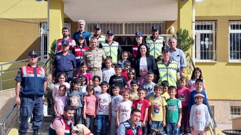 Trafik kuralları konusunda bilgilendirilen çocuklar, jandarma köpeğinin gösterisini ilgiyle takip etti.