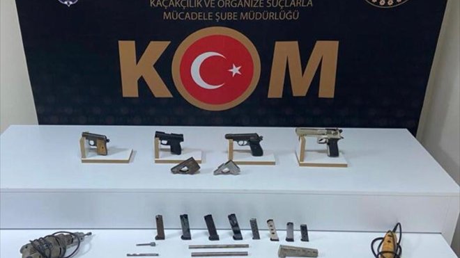 Şüphelilerin iş yerlerinde yapılan aramada, 4 ruhsatsız tabanca, 22 fişek, 10 tabanca yapımında kullanılan tetik, tabanca gövdesi, sürgü, namlu, 8 tabanca şarjörü, tabanca namlusu açmaya yarayan matkap, taşlama makinesi ve 6 taşlama ucu ele geçirildi.