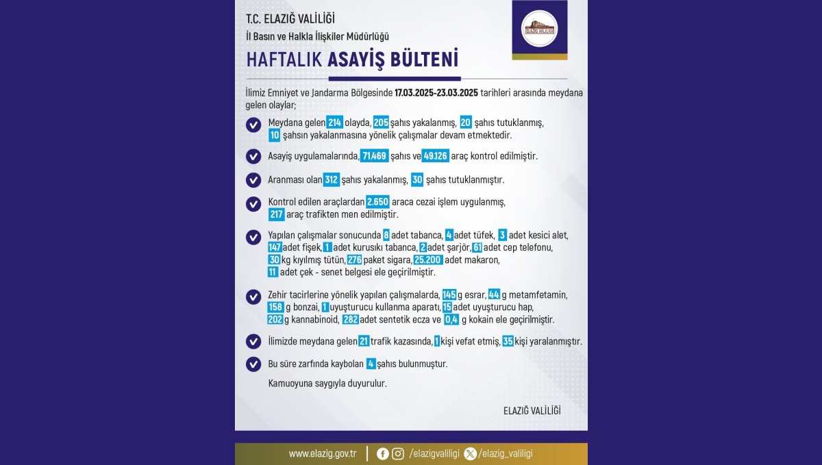 Elazığ'da son bir haftalık asayiş bülteni açıklandı. Buna göre kentte 214 olay meydana gelirken 205 şahıs yakalandı.