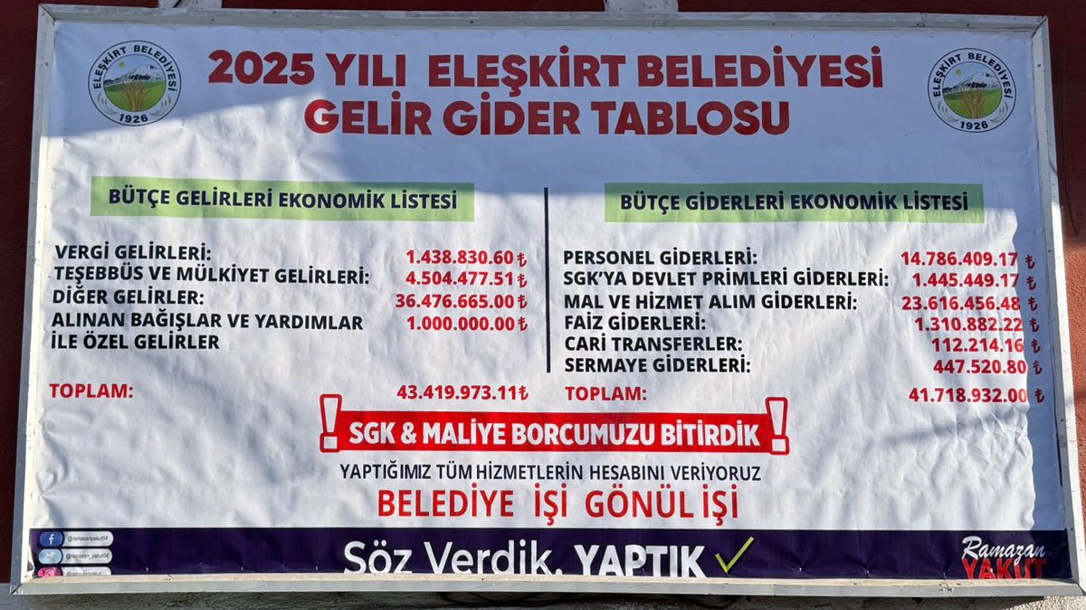 Ağrı'nın Eleşkirt ilçesinde, Belediye Başkanı Ramazan Yakut tarafından 2025 yılı Ocak-Haziran dönemine ait belediye bütçesi gelir-gider tablosu kamuoyuna açıklandı.