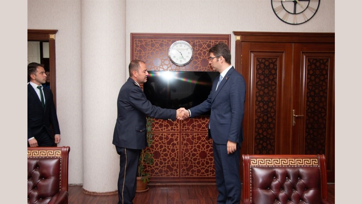 İlçe Emniyet Müdürü Trak, ziyaretin anısına Kaymakam Karaloğlu'na çiçek takdim etti.