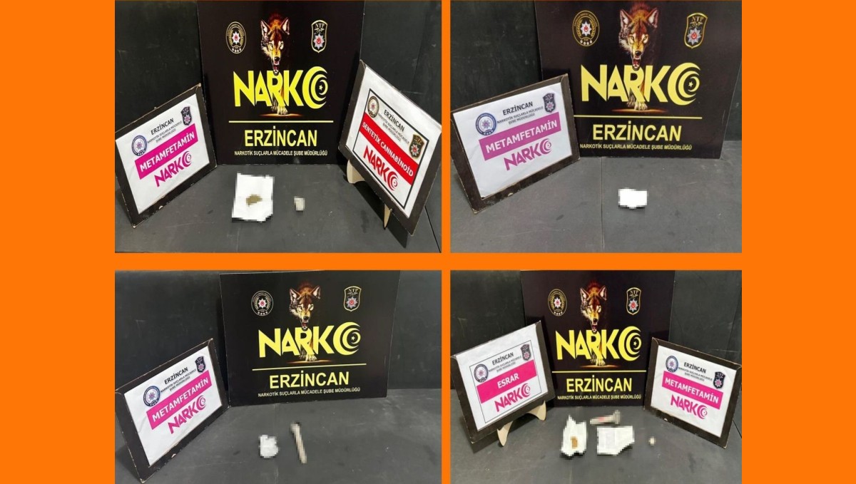 Erzincan İl Emniyet Müdürlüğü Narkotik Suçlarla Mücadele Şube Müdürlüğü ekiplerince, uyuşturucu madde ticareti yapan ve kullanan şahıslara yönelik yapılan çalışmalarda; 1,32 gram sentetik cannabinoid (bonzai), 2,53 gram metamfetamin, 0,61 gram esrar maddesi, 2 adet cam aparat ele geçirildi.