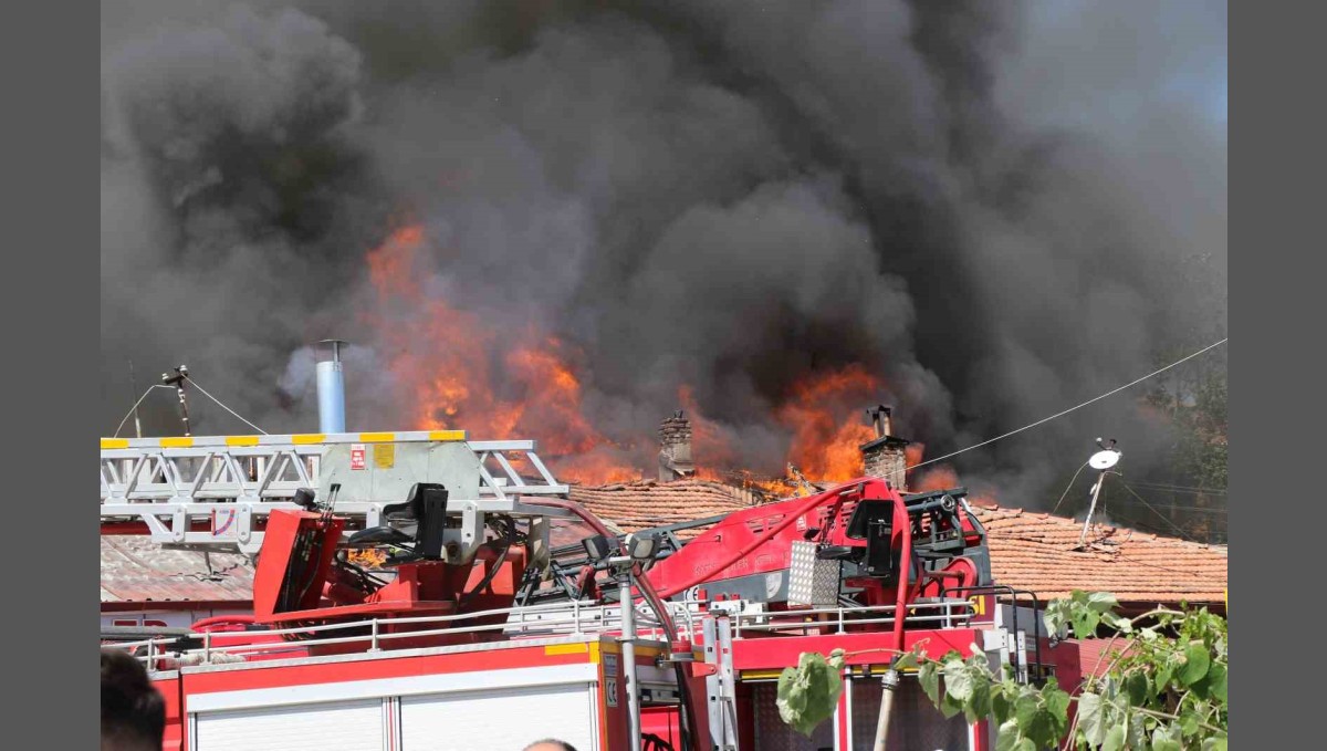 Erzincan'da Buğday Meydanı'nda ahşaptan sıralı dükkanların çatısında çıkan yangına müdahale ediliyor.