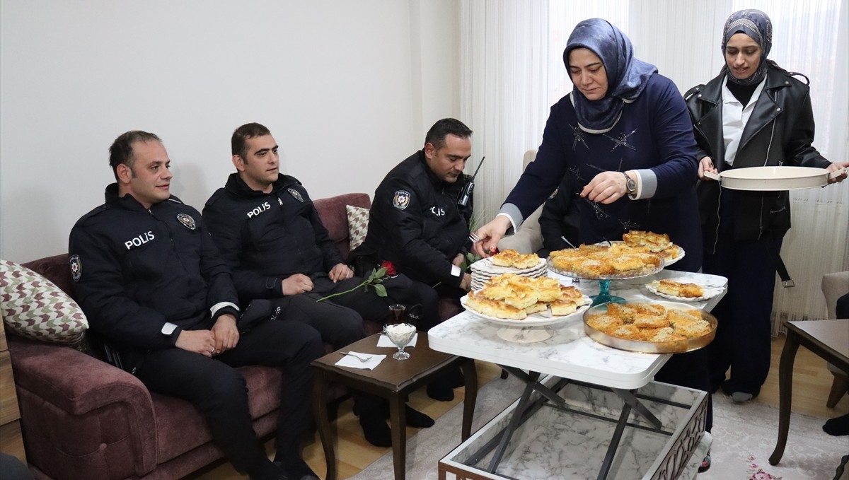 El açması börek, kesme kadayıf tatlısı ve çay ikramında bulunulan polislere, çiçek takdim edildi.