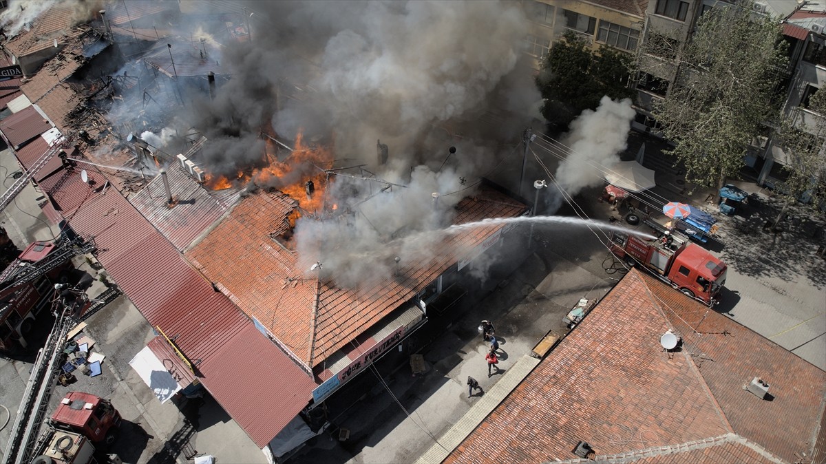 Şehir merkezindeki Buğday Meydanı'nda bulunan tek katlı sıralı haldeki iş yerlerinin çatısında yangın çıktı.