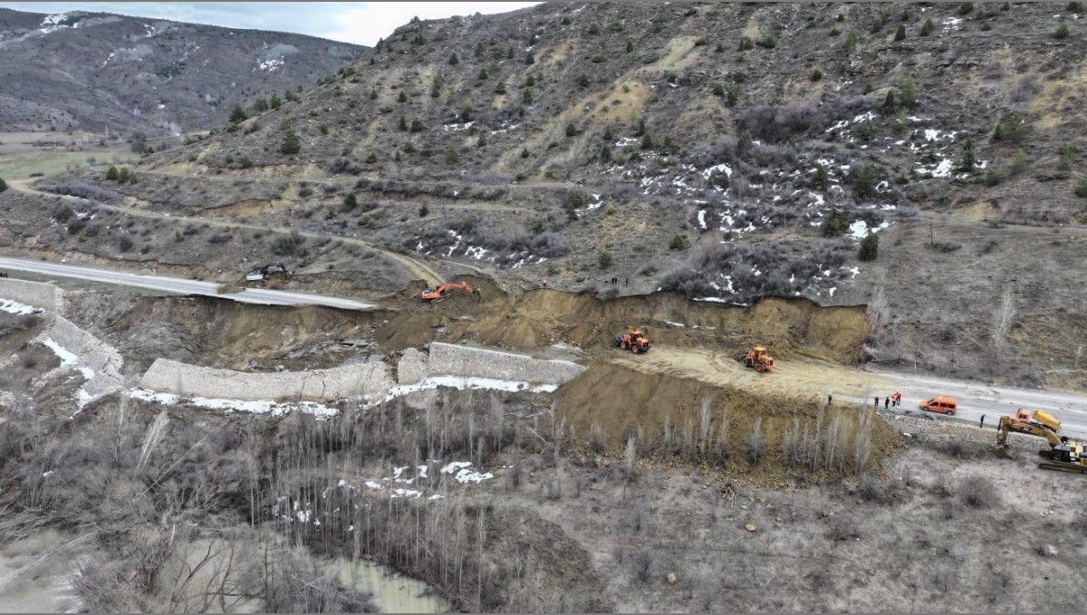 ERZİNCAN (İHA) - Ani kar erimelerinin tetiklemesi sonucu Erzincan-Kelkit yolunda meydana gelen heyelan nedeniyle hasar gören karayolunun yapılması için çalışmalar sürüyor. Güzergahı kullanan araçlar için alternatif yoldan ulaşım sağlanırken bu güzergah ağır tonajlı araçlar için trafiğe kapatıldı. Erzincan istikametinden Kelkit yönüne gidecek ağır tonajlı araçların geçişine Yalnızbağ mevkiinden itibaren müsaade edilmiyor.