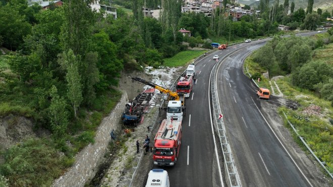 Erzurum-Tortum kara yolunda Azerbaycan'dan Konya'ya plastik ham maddesi taşıyan Burhan Türkmen (42) yönetimindeki 33 E 2316 plakalı tır, Aksu Mahallesi civarında yol kenarındaki demir bariyerlere çarparak şarampole devrildi.