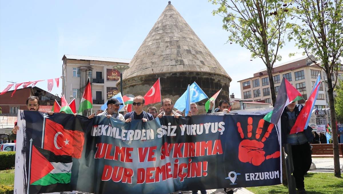 Kent merkezindeki Erzurum Kalesi önünde bir araya gelen aralarında doktor ve tıp fakültesi öğrencilerinin de bulunduğu sağlıkçılar, Türk, Filistin ve Doğu Türkistan bayrakları eşliğinde, taşıdıkları döviz ve pankartlarla kalenin içinde yürüdü.