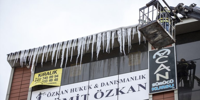 Büyükşehir Belediyesi itfaiye ekipleri de bu tehlikenin önüne geçmek için cadde, sokak ve kaldırımlardaki kar temizliğinin yanı sıra çatılardaki buzları da kırıyor.