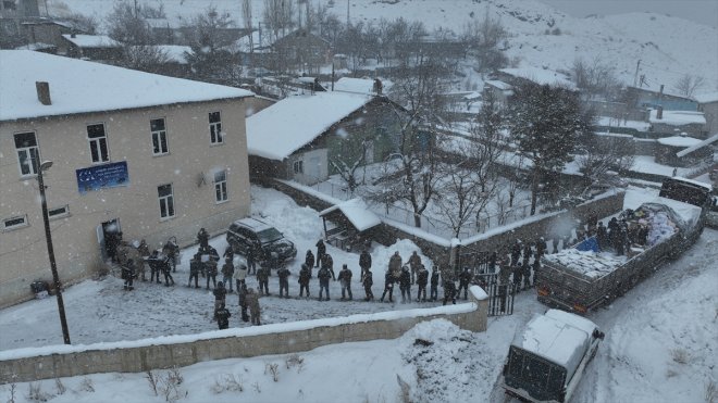 Yoğun kar yağışı altında jandarma, polis, kurum görevlileri ve vatandaşlar tarafından yüklenen tır, dualarla Kahramanmaraş'a gönderildi.