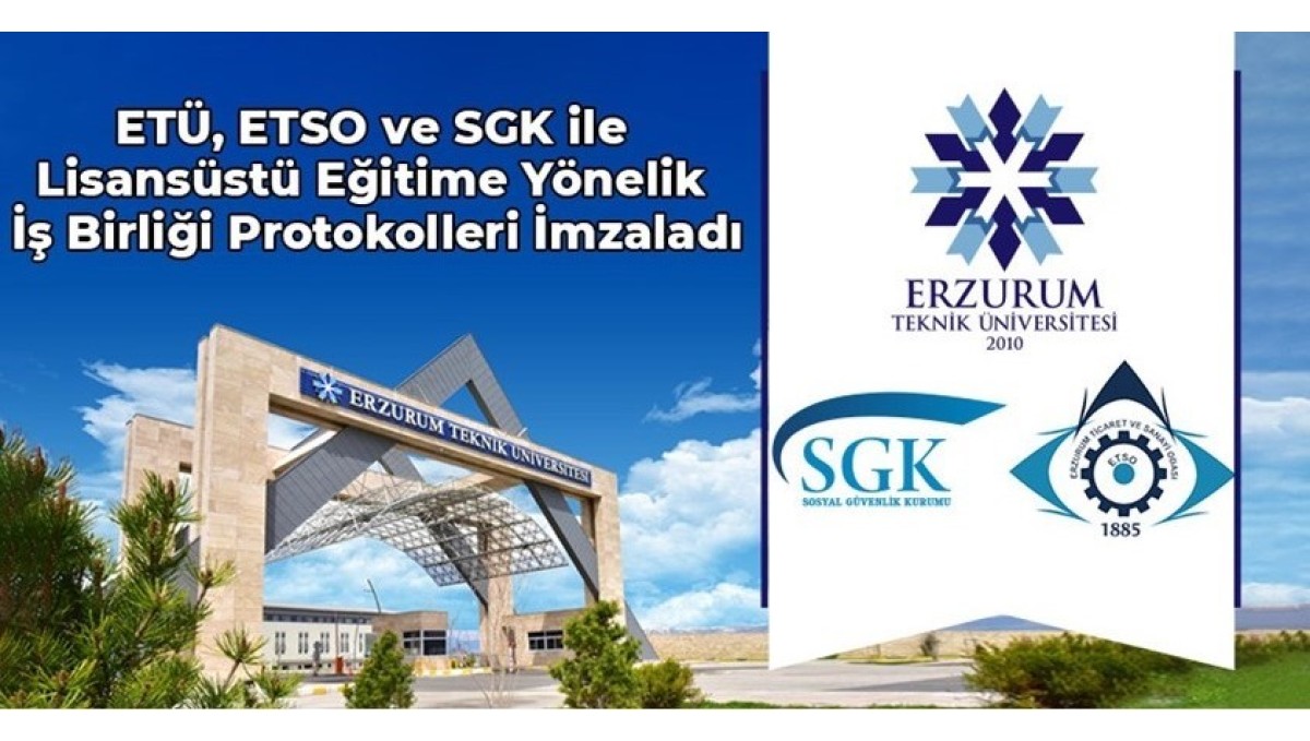 Erzurum Teknik Üniversitesi (ETÜ) kamu ve yerel paydaşlarıyla iş birliğini güçlendirmeye devam ediyor. Bu kapsamda Erzurum Ticaret ve Sanayi Odası (ETSO) ve Erzurum Sosyal Güvenlik İl Müdürlüğü (SGK) ile lisansüstü eğitime yönelik iki ayrı iş birliği protokolü imzaladı.