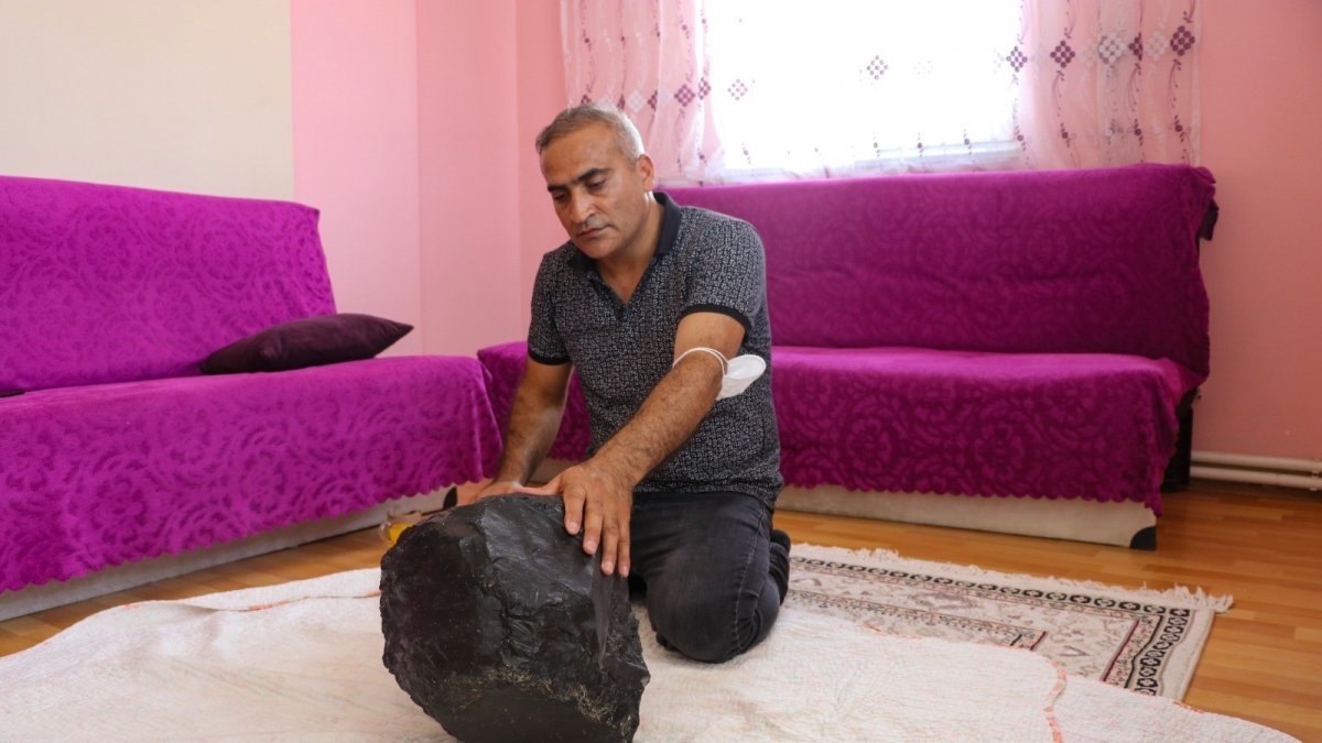 Iğdır - Iğdır'da ikamet eden 44 yaşındaki Turgut Oğuz, 2018 yılında eşinin ve kızının Ağrı'nın Diyadin ilçesinde bulunan kaplıcalara gittiğini ve orada fotoğraf çekerken ilginç bir durumla karşılaştıklarını söyledi. Oğuz, "2018 yılında benim çocuklar Diyadin'de bulunan kaplıcalara gitmişlerdi. Dönüş yolunda hatıra fotoğrafları çekiyorlar. O hatıra fotoğraflarında taşın düştüğü anı fark etmiyorlar. Eve geldiklerinde çektikleri fotoğrafları bana gösterdiler. Resimlere bakarken baktım ki bir taş düşüyor. Hemen ertesi gün taşın düştüğü bölgeye gittim. Taşın düştüğü yer belli. Kurtköy diye bir yol var. O yol ayrımında durdum. Sonra 100 metre ilerde simsiyah renkte uzaktan poşete benzeyen bu taşı gördüm. Düştüğü yer belli. Yoldan yaklaşık 150 metre uzağa düşmüştü. Yolun kenarında kanal açarken düşmenin şiddetiyle yol paralel şekilde düşmüştü. Teyzemin oğluyla beraber gitmiştim. Taşın ağırlığı 65 kilogram. 2018 yılında bunu bulup alıp buraya getirdik. Sonra notere giderek taşı bulduğuma dair sözleşme imzaladım" dedi.