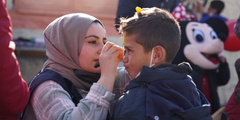 Vali Okay Memiş'in talimatıyla depremden etkilenen ilçeye bağlı kırsal mahallelere giden 25 kişilik gönüllü ekip, buradaki okullarda öğrencilerle bir araya geldi.