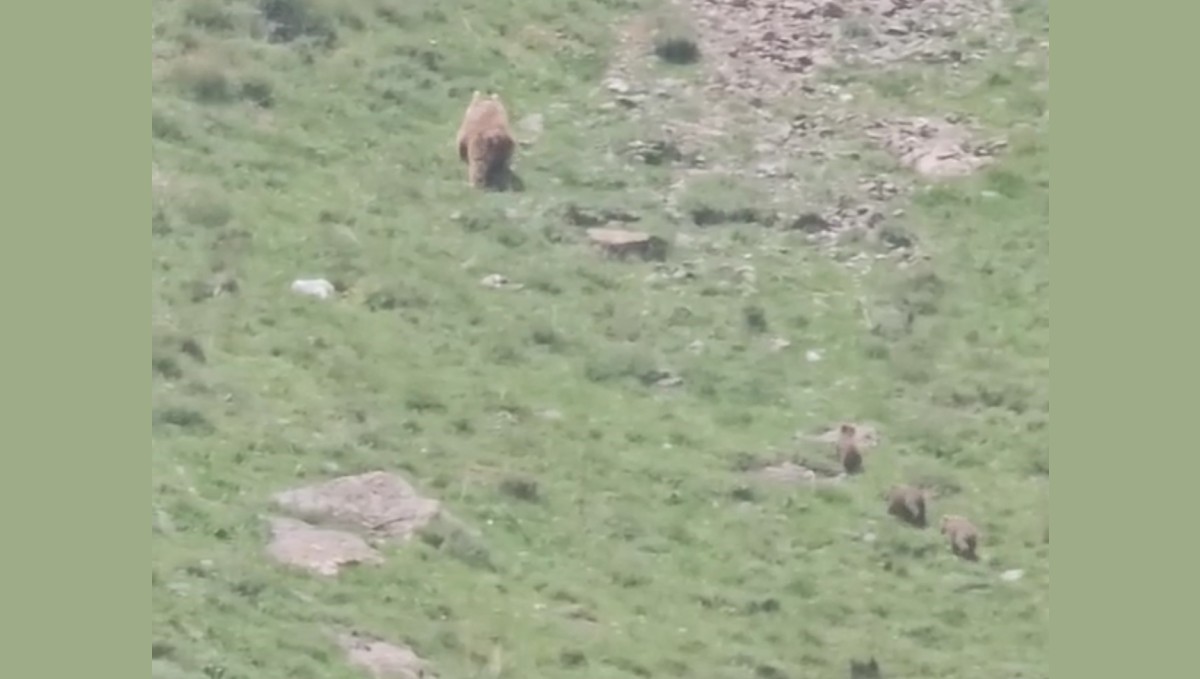 Hakkari ve Yüksekova ilçesi arasında yer alan Doğanyurt köyünde havaların ısınmasıyla kış uykusundan uyanan bir anne ayı ve üç yavrusu, yaylada gezinirken görüntülendi.