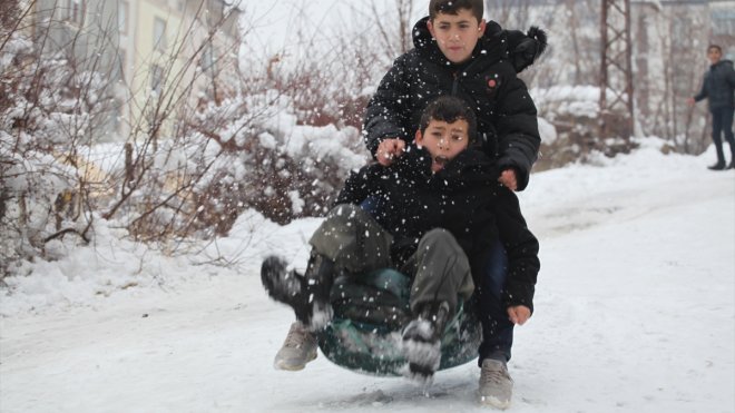 Hakkâri - Şemdinli'de çocuklar etkili olan kar yağışının ardından poşet ve plastik bidonlarla kayarak eğlenceli anlar yaşadı.