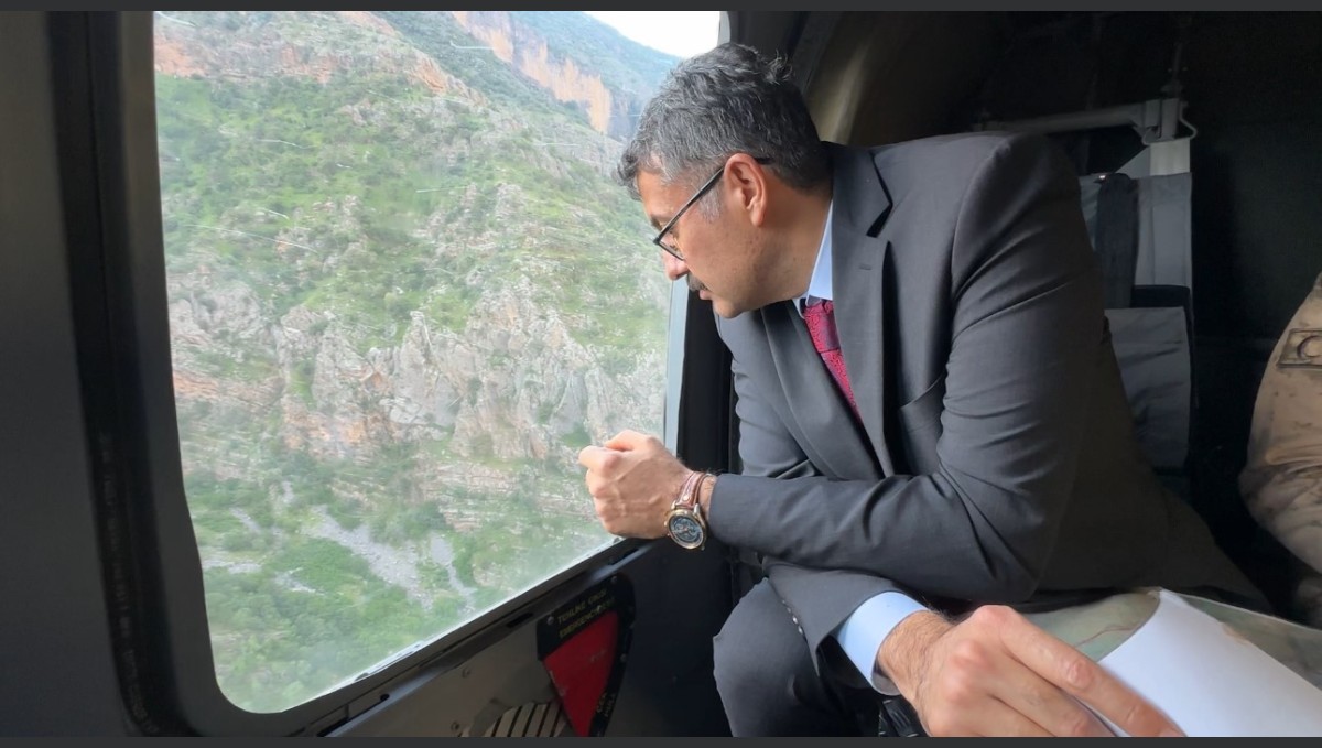 Hakkari Valisi Ali Çelik, girdiği derede kaybolan 16 yaşındaki İbrahim Necir Kom'u arama çalışmalarını havadan inceledi.