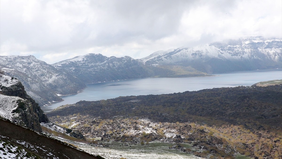Bitlis'in Tatvan ilçesinde de kar nedeniyle Nemrut Dağı ve yüksek kesimler beyaz örtüyle kaplandı.