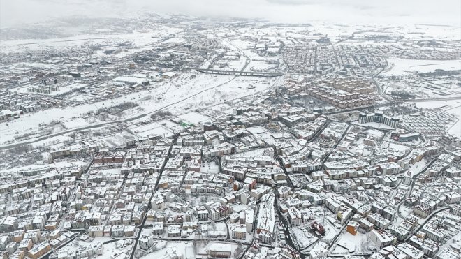 BİNGÖL - Bingöl'de kar yağışıyla beyaza bürünen kent merkezi havadan görüntülendi.