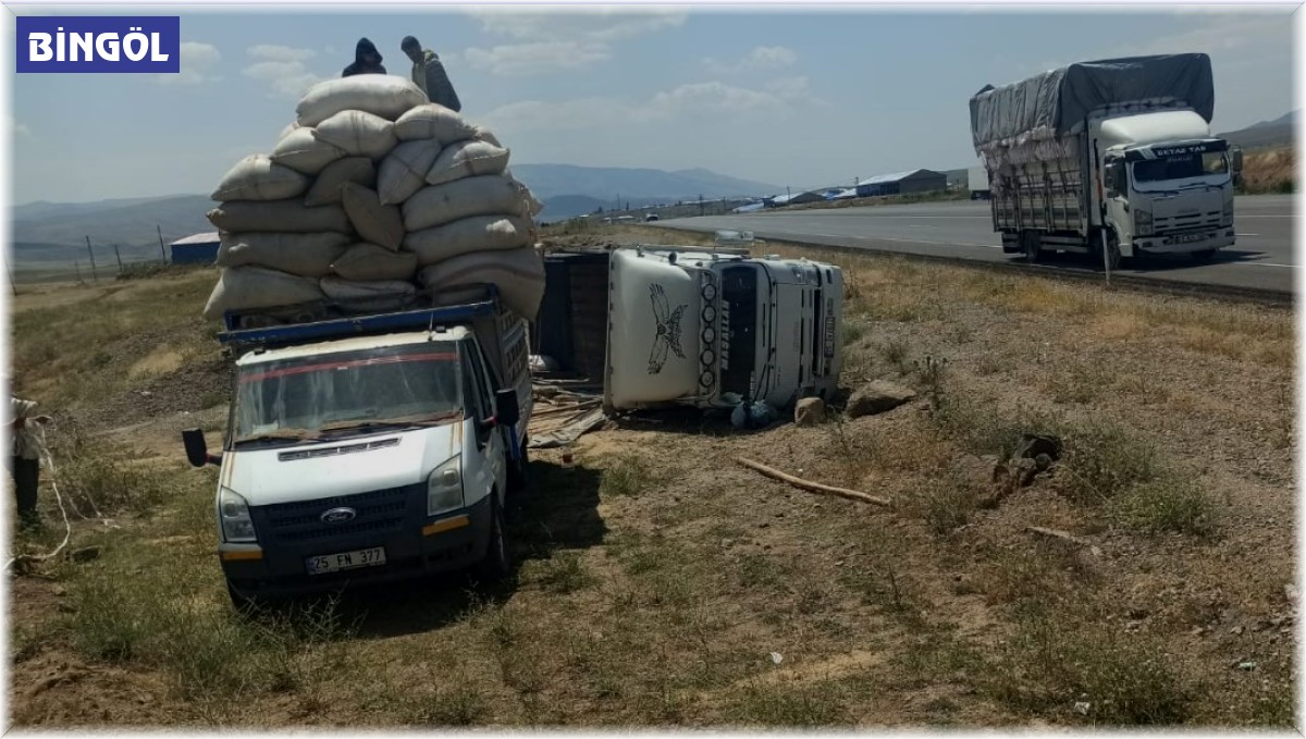 Bingöl'ün Karlıova ilçesinde saman yüklü kamyon devrildi, kazada yaralanan olmadı.