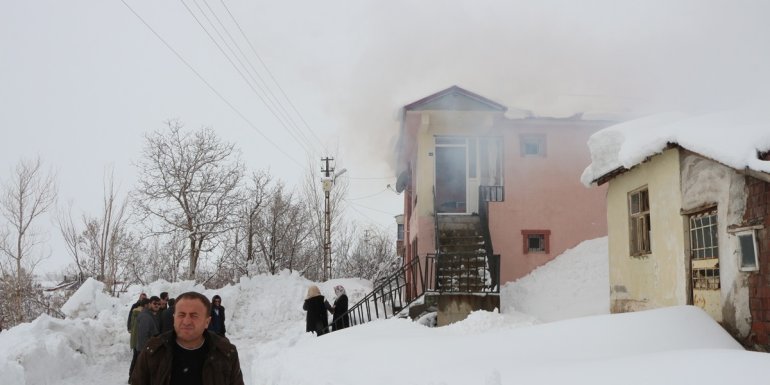 Kar nedeniyle kapanan mahalle yolunun iş makinası tarafından açılmasının ardından eve ulaşan ekipler, yangını büyümeden söndürdü.